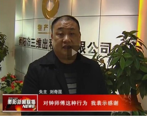 ???根據劉先生提供的素材, 衡陽媒體對鐘冬衛(wèi)進行了深入采訪,于4月6日晚在衡陽電視臺“衡陽新聞聯播”及“衡陽天天生活”欄目播出題為“身邊雷鋒、衡陽好人”的專題新聞,在行業(yè)內產生廣泛影響,4月7日在“湖南衛(wèi)視公共頻道”再次播出。衡陽三維的哥鐘冬衛(wèi)不僅成為衡陽市的哥的好榜樣,也成為湖南省出租司機的楷模。