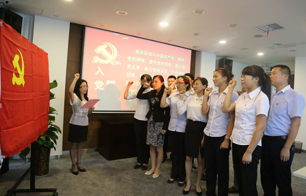 ??????? 儀式開始后,在公司黨委辦公室負責人楊玉英的帶領下,來自總部及成員單位的13名新黨員面向鮮紅的黨旗, 右手握拳莊嚴宣誓,表達為共產主義事業(yè)奮斗終生的決心。